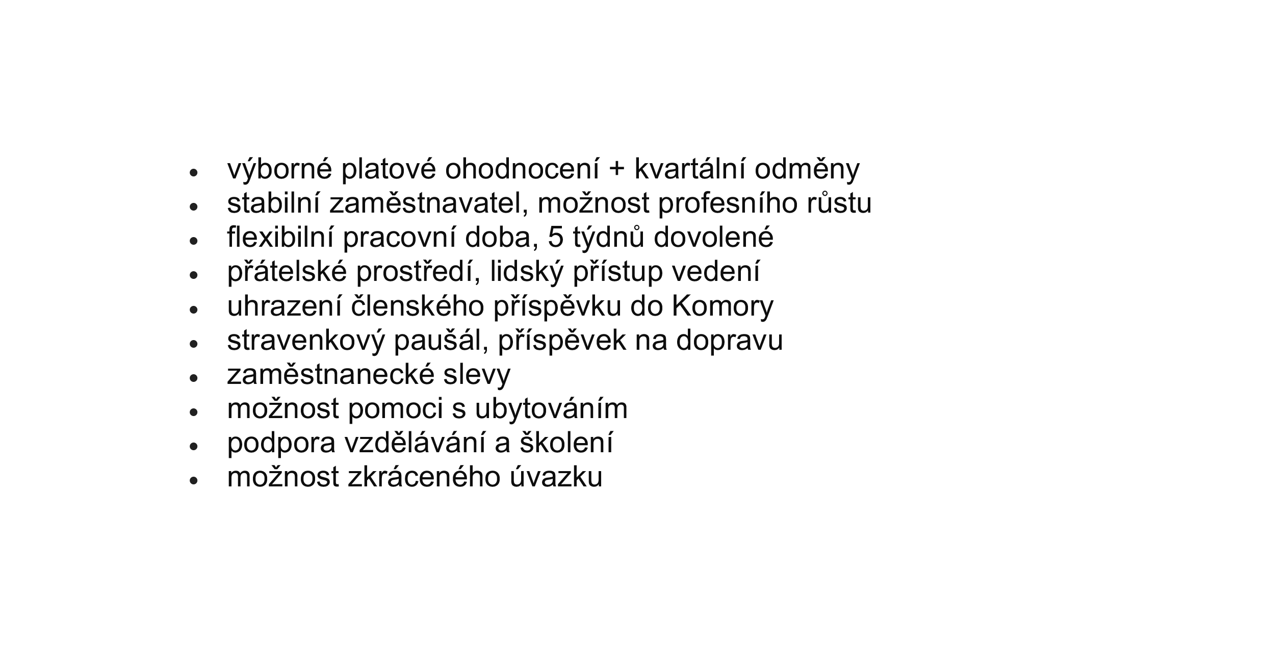 Pracovní doba po-pá, volné víkendy i svátky. Nabízíme 5 týdnů dovolené, dobré platové ohodnocení, náborový příspěvek, úhradu členského příspěvku ČLnK, zaměstnanecké slevy.