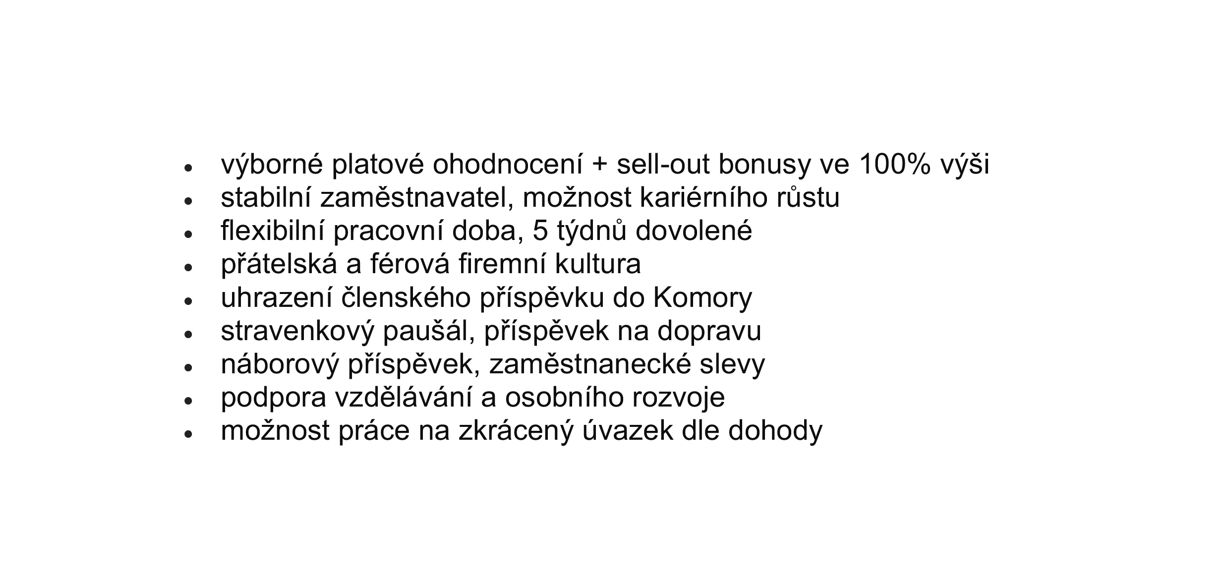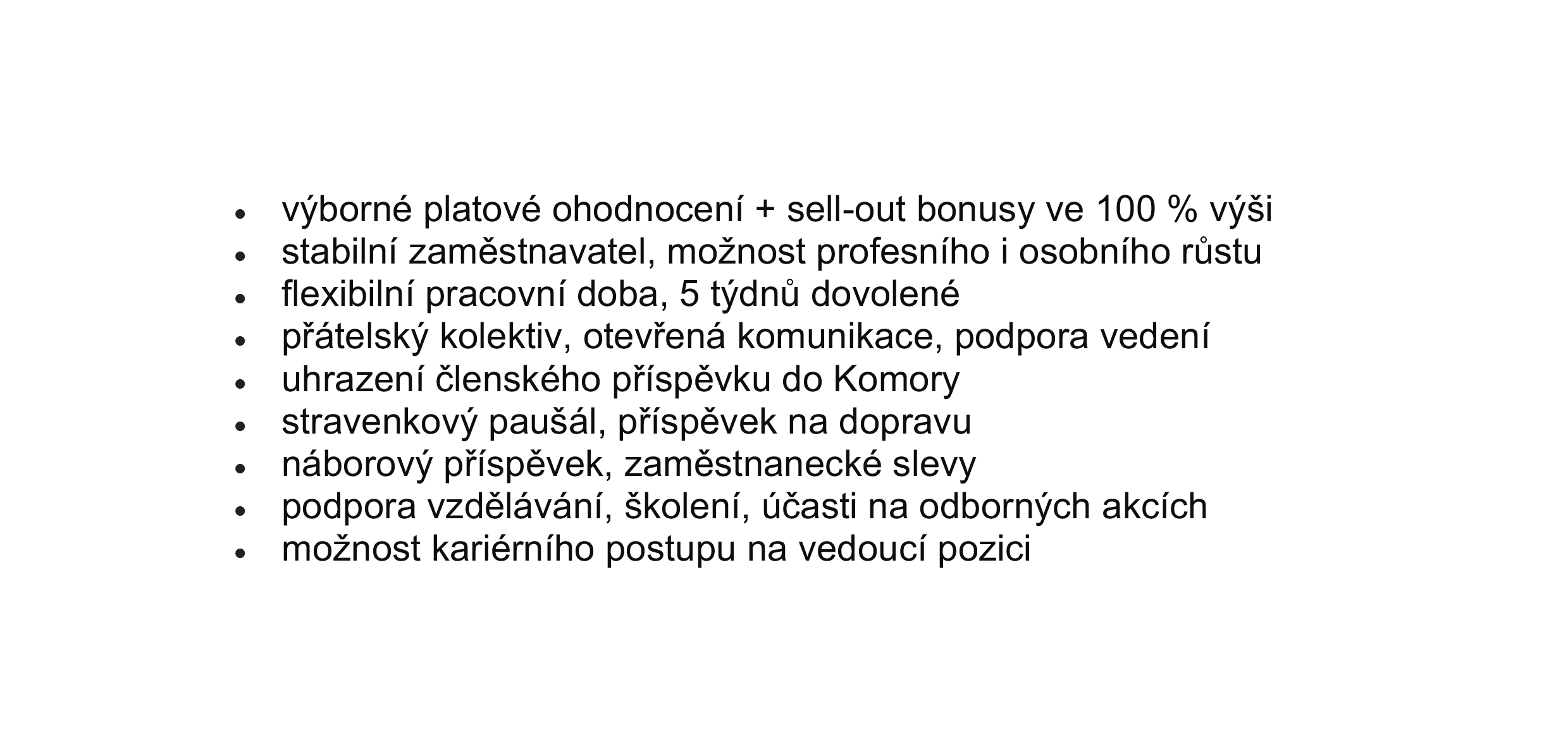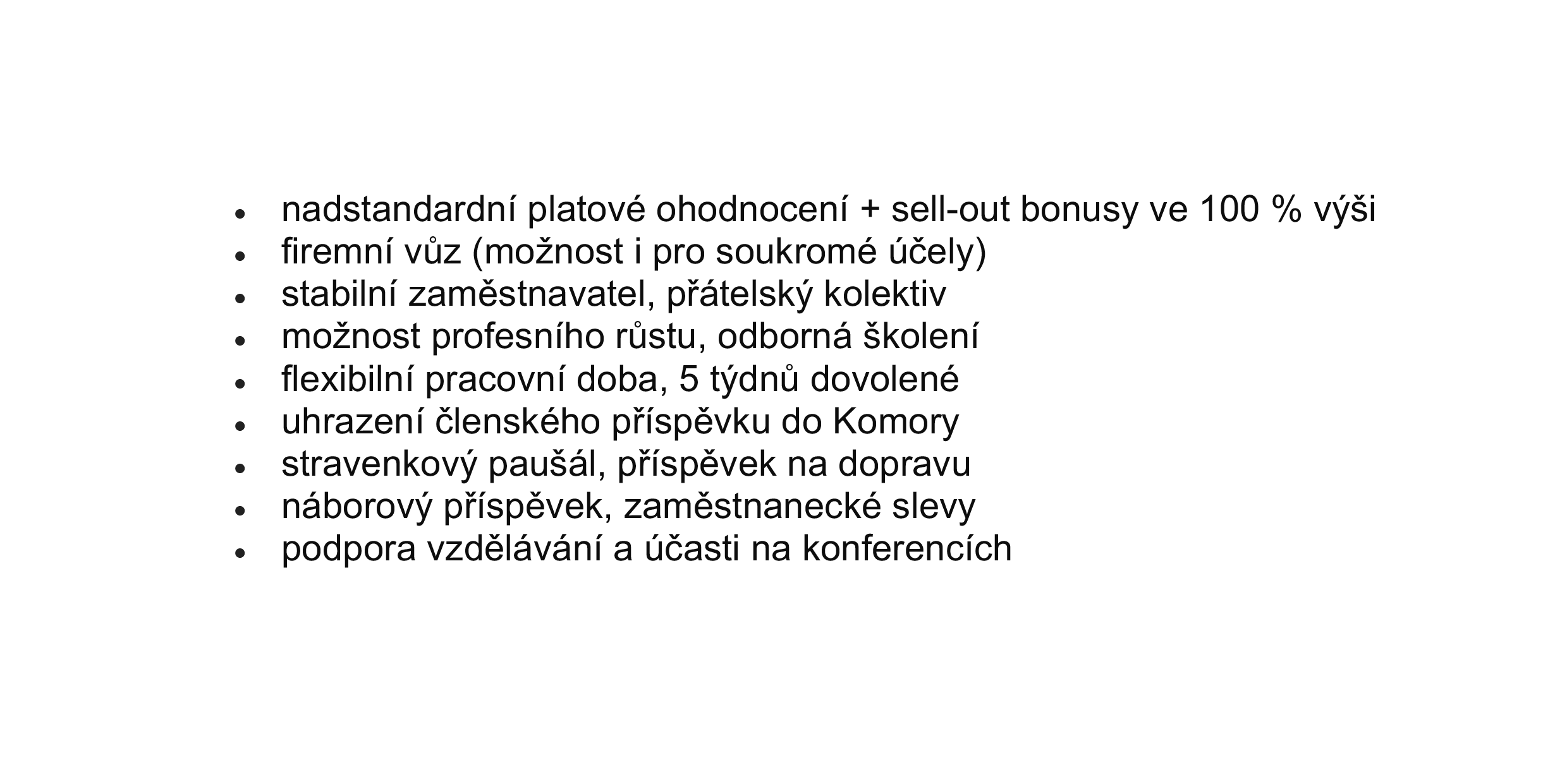 Nabízíme nadstandardní platové ohodnocení a odměny z prodeje, 5 týdnů dovolené, stravenky, cestovní náhrady, zaměstnanecké slevy, příspěvek na zdravotnické oblečení a obuv, příjemné pracovní prostředí a přátelský kolektiv.