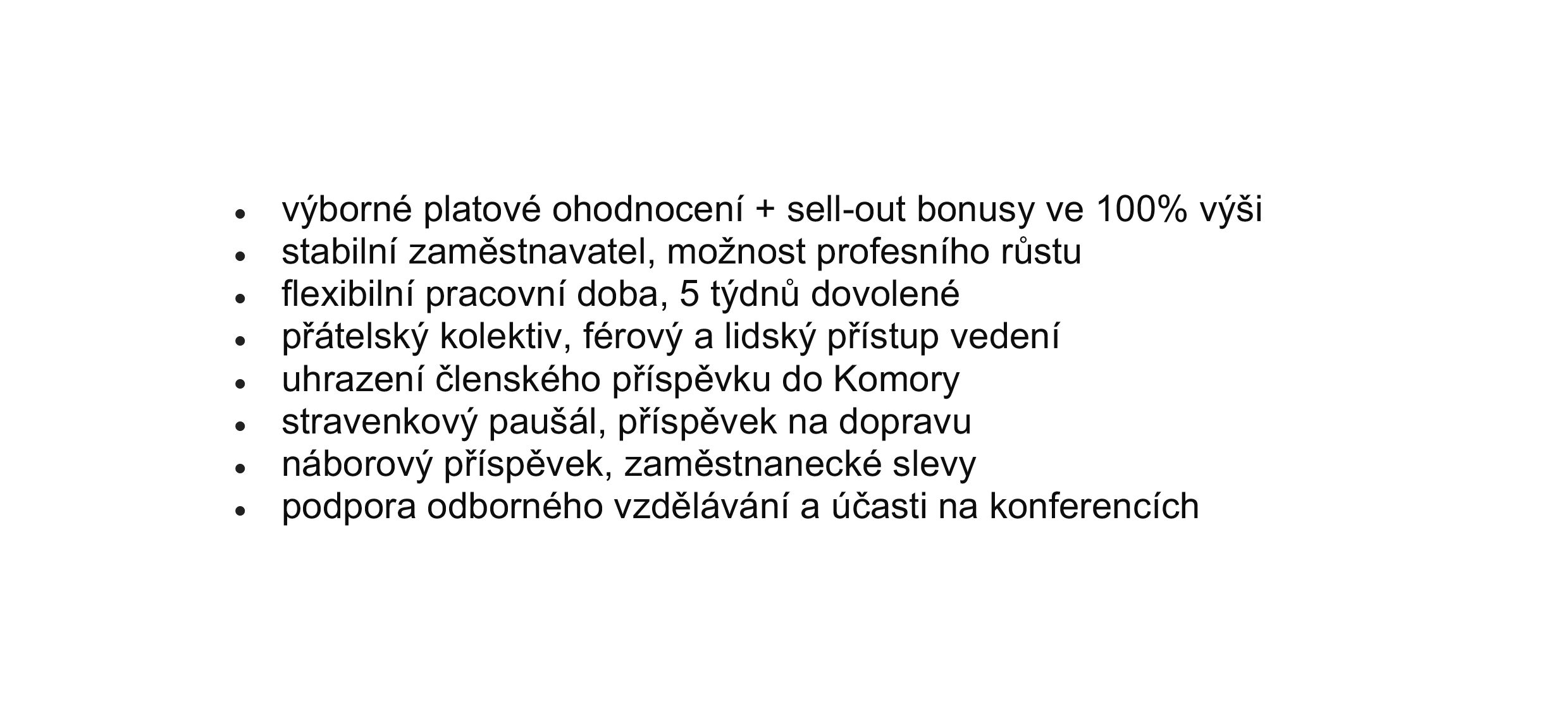 Nabízíme nadstandardní platové ohodnocení a odměny z prodeje, 5 týdnů dovolené, stravenky, cestovní náhrady, zaměstnanecké slevy, příspěvek na zdravotnické oblečení a obuv, příjemné pracovní prostředí a přátelský kolektiv.
